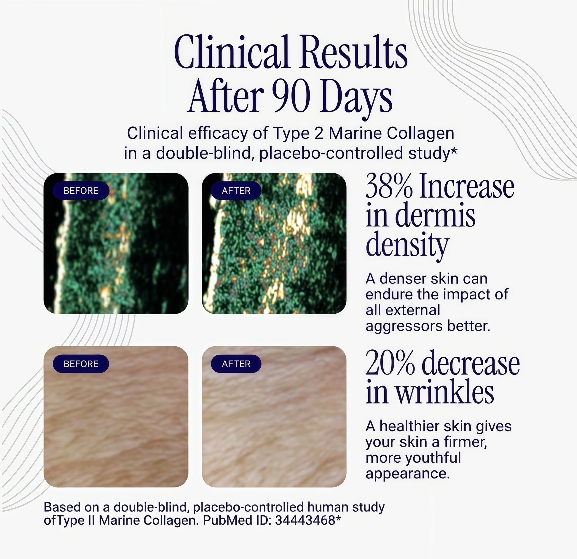 1 In a double-blind, placebo-controlled human study, participants taking this Type ll Marine Collagenexperienced a 20% reduction in wrinkle appearance over 90 days, particularly in frown lines and crow'sfeet areas.